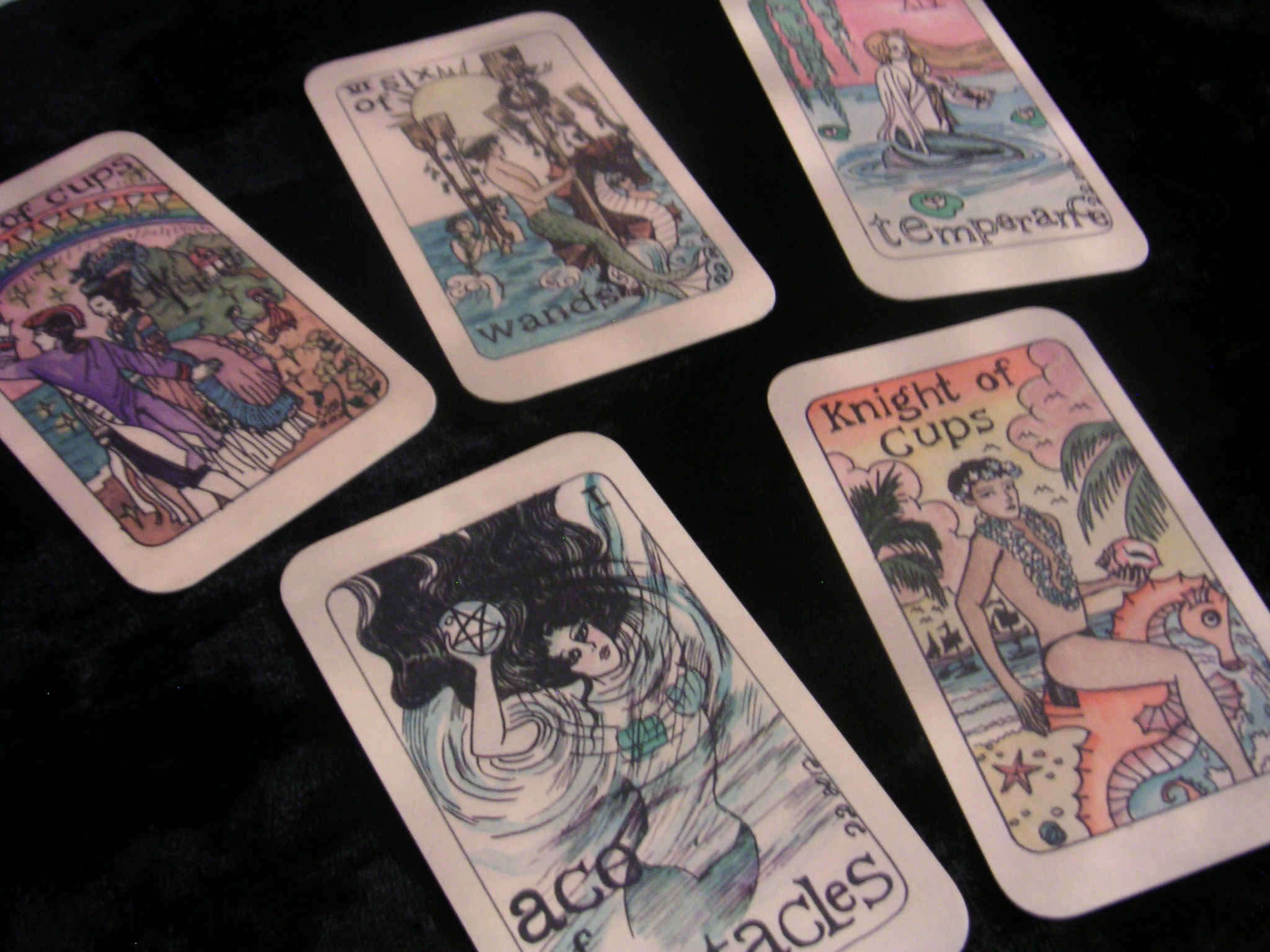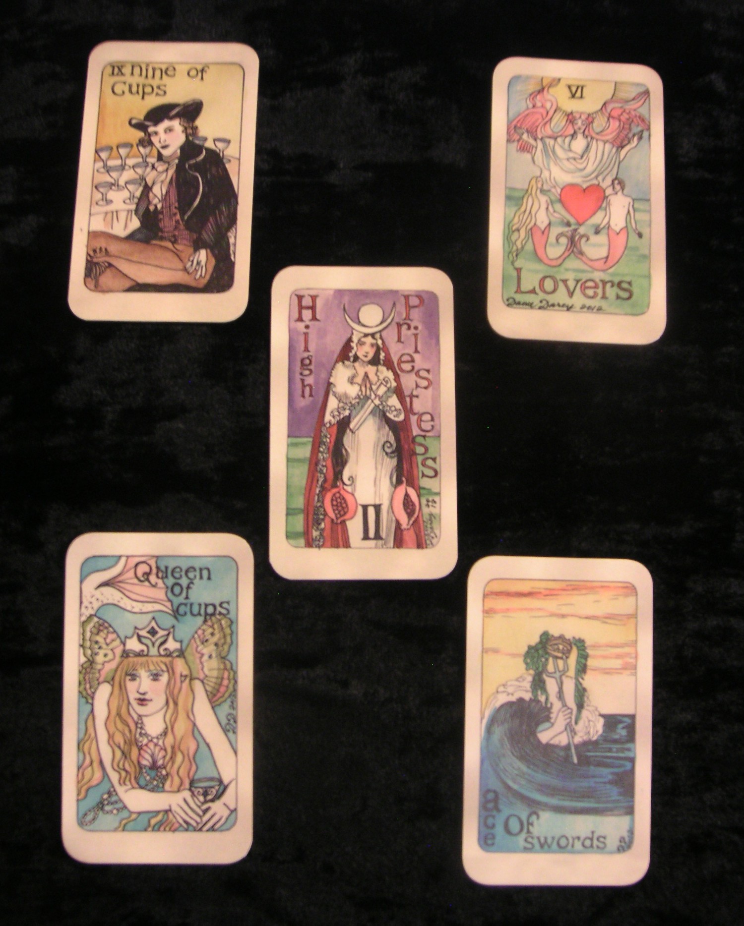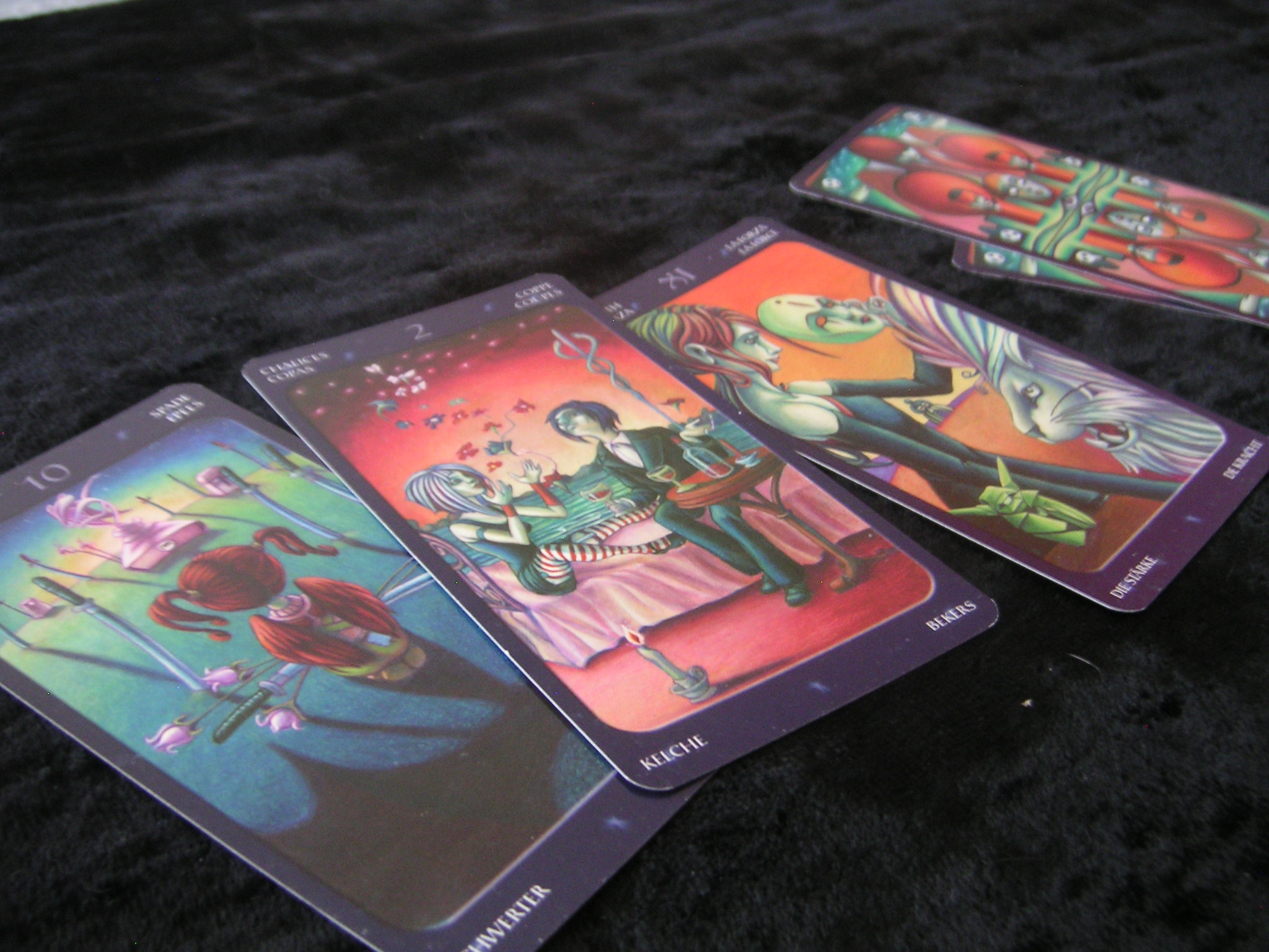 I am currently reading with The Mermaid Tarot with art by the incomparable Dame Darcy. (Pictured at the top and to the right.) Dame Darcy’s art is deeply influenced by her magical lifestyle. This deck is full of powerful, watery imagery that deftly addresses concerns of an emotional, intuitive, and spiritual nature while also speaking to concrete, practical matters. It is a colorful, feminine deck that helps bring up the treasures of one’s spiritual and mental depths. Interested in a reading with a different deck? I also read with The Tarot of the Sweet Twilight, a darkly whimsical and intuitive deck based on the Rider-Waite-Smith system. You can see a sample of this deck below. It is filled with fae creatures and is ideal for readings regarding a range of liminal concerns.