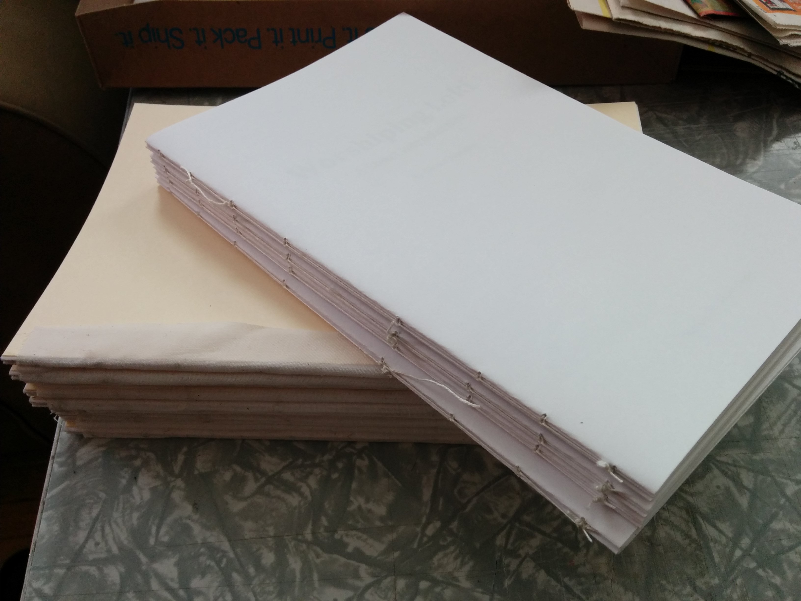 I realized I’ve been a bit reluctant to share pictures of the progress because for the most part, book binding looks pretty boring. There’s a lot of glue and stacks of paper. It’s not until everything is put together at the very end that it starts to look interesting. Still, everyone has given me a very profound gift of trust and I owe it to the many people who have supported this project to be as forthright as possible. A big batch of books will go under weight this evening, which means that the first wave of shipping will occur sometime tomorrow. I’ve had some car trouble this week but I can hop on the bus first thing in the morning and go down to the post office without too much difficulty (assuming that my gimpy leg is going to allow me that much walking).